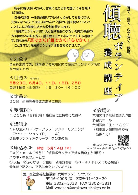 ≪対象≫ 全日程出席でき、講座終了後荒川区内で傾聴ボランティア活動を希望する方